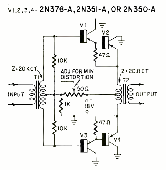 Esta etapa de potência com 15 W foi encontrada na revista Radio Electronics de agosto de 1959. Os transistores são do tipo de potência da época e a alimentação feita com 18 V.