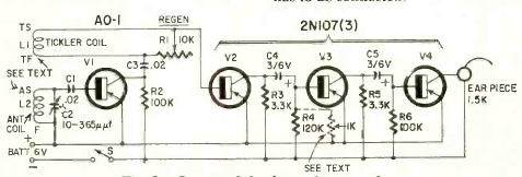A montagem deste receptor regenerativo para ondas médias com 4 transistores foi descrita num artigo da revista Radio Electronics de abril de 1961. A escuta era em fone e a alimentação por bateria.