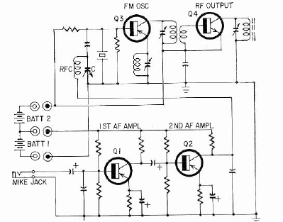 Este circuito foi encontrado numa revista Radio Electronics de julho de 1964. O circuito usa 4 transistores e opera na faixa de FM com bom desempenho graças ao uso de duas etapas de FM que proporciona estabilidade. A alimentação vem de duas baterias.