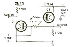 Este circuito oscilador com dois transistores é de uma documentação de 1965. O circuito é do tipo biestável operando com um sinal de sincronismo externo.