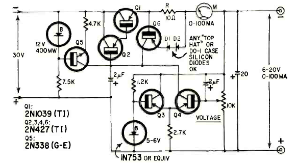 Esta fonte de 6 a 12 V com corrente até 100 mA foi encontrada na revista Radio Electronics de junho de 19666. A fonte possui indicador de corrente e usa transistores da época.