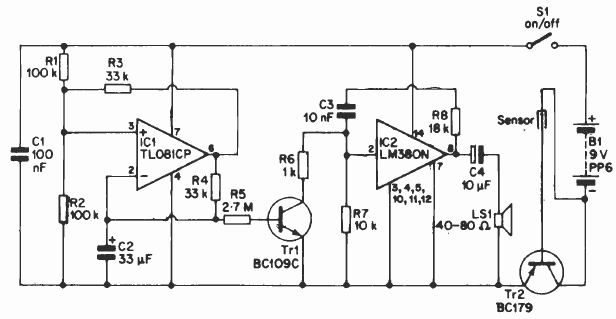 Este circuito foi encontrado numa documentação inglesa dos anos 90. Componentes equivalentes, como os transistores, podem ser usados. O sensor consiste em duas varas metálicas. Nunca use fonte sem transformador para alimentar este circuito.