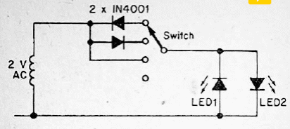 Já apresentamos este circuito em outros pontos de nosso site. Esta versão de uma documentação inglesa não usa resistor limitador dada a baixa tensão de entrada AC. Para mais de 2 V é importante ligar um resistor de 47 ohms a 1k em série com os LEDs.