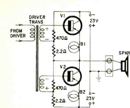 Esta etapa de potência com transistores é estabilizada por duas lâmpadas. O circuito foi publicado na revista Radio Electronics de abril de 1962. Os transistores e a potência não foram indicados.
