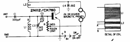 Este simples circuito de 1 transistor foi encontrado numa documentação americana dos anos 60. O fone é magnético e o transistor de germânio da época.