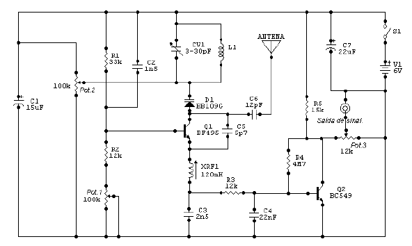Este circuito foi enviado pelo leitor e colaborador Adriano Muniz Moura de Pirapora – MG. O projeto apresentado é usado para a recepção na faixa de FM (87,9MHz a 109,9MHz ) e pode ser usado em conjunto com um amplificador áudio e pode captar emissoras localizadas á vários quilômetros de distância. A base do circuito é um diodo varicap assim firmando o sinal recebido pelo receptor e a antena usada pode ser qualquer uma tipo telescópica comum. Os resistores usados são de 1/8 w e os capacitores são para 12v. A fonte de alimentação usada pode ser qualquer uma que tenha boa filtragem ou mesmo pilhas do tipo AA. O capacitor variável CV1 é de 3-50pF tipo plástico comum e a bobina L1 é formada por 5 espiras de fio 18 com 1cm de diâmetro sem núcleo e pode ser ajustada juntamente com trimmer (apertando-a). Os potenciômetros pot1 e pot2 são usados para ajuste da seletividade do circuito e para melhor uso do mesmo pode ser levado sua saída ao amplificador. A placa usada deve ser do tipo fibra de vidro para uma maior qualidade de sinal.