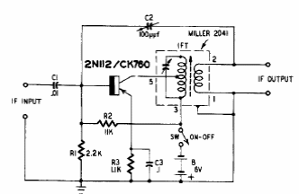 Encontramos este circuito simples de FI num livro dos anos 50. O transistor é de germânio e a bobina é de tipo comercial da época.