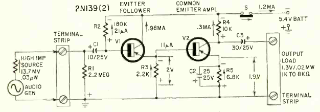 Este circuito foi obtido na revista Radio Electronics de agosto de 1962. Trata-se de um amplificador em tandem com dois transistores para pequenos sinais, A alimentação é feita com a tensão indicada.