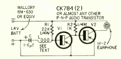 Este amplificador para fone de ouvido usando bobina captadora pode ser usado como extensão para aparelhos como TV, ou ainda em outras aplicações de bancada. O circuito é de uma Radio Electronics de junho de 1963.