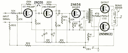 Este circuito é de uma Radio Electronics de julho de 1965. O circuito usa componentes da época controlando também um servo da época. A alimentação é de 28 V.