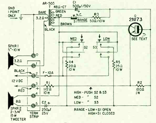 Este circuito produz sons de 6 notas diferentes conforme as chaves acionadas. O circuito é de uma Radio Electronics de maio de 1965. O transistor deve ser dotado de radiador de calor.