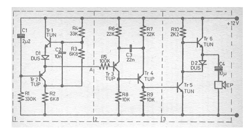 Encontramos esta sirene transistorizada numa antiga publicação inglesa. Os transistores são da época, mas podem ser usados equivalentes atuais. A frequência pode ser alterada com a troca de componentes.