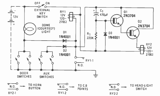 Encontramos este circuito para imobilização do sistema de ignição de um carro na revista Radio Electronics de dezembro de 1976. O circuito aproveita as chaves de acionamento das luzes de cortesia.