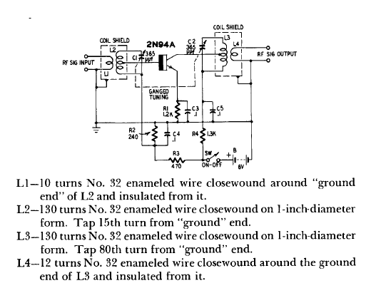 Este circuito amplificador de frequência intermediária foi encontrado numa publicação americana dos anos 50. O transistor é da época e dados sobre as bobinas são fornecidos.