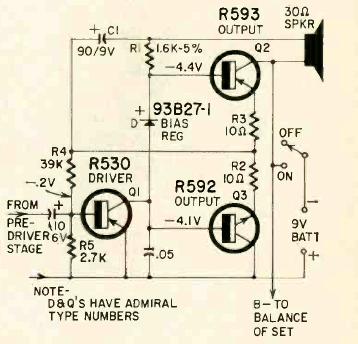 Este circuito transistorizado com saída complementar saiu na revista Radio Electronics de abril de 1963. Os transistores são tipos comerciais da época, sendo esta etapa usada num rádio comum.