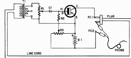 Os valores dos componentes neste circuito experimental são os do circuito anterior. O fone é magnético de alta impedância e o transistor de germânio.