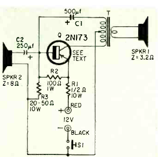 Este circuito foi encontrado numa Radio Electronics de maio de 1965. O transistor é de potência e no projeto original usa a caixa de metal como dissipador. O circuito opera com dois alto-falantes.