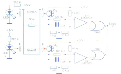 Este circuito, visto na figura, também é sugerido pela Texas Instruments e mostra como se pode controlar o nível de um reservatório de água (ou outro líquido transparente) utilizando-se sensores de passagem. O que temos são dois sensores que são posicionados em níveis diferentes do reservatório, sendo focalizados em fontes de luz que no caso são LEDs. O corte do feixe de luz por uma boia faz com que os circuitos sensores atuem sobre um flip-flop TTL montado com portas de um 7402, mudando-o de estado. Assim, temos a produção de sinais nos níveis A e B, que servem tanto para ligar uma bomba para encher o reservatório no nível B como para desligá-la quando a boia atingir o nível A. O circuito deve ser alimentado com 5 V e a sensibilidade elevada exige que os focos de luz dos LEDs sejam rigorosamente apontados para os sensores, que não podem receber luz de outras fontes.