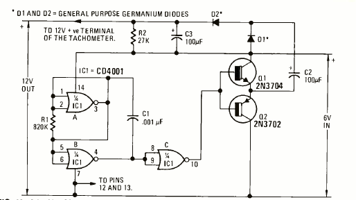 Este circuito chaveado foi encontrado na revista Radio Electronics de abril de 1976. O circuito tem baixa corrente sendo indicado para aplicações digitais de 6 V.