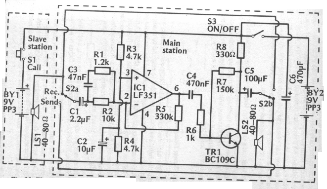 Este circuito de intercom com fio foi encontrado numa publicação inglesa dos anos 80. O circuito integrado pode ser substituído por equivalente, assim como o transistor que é de uso geral.