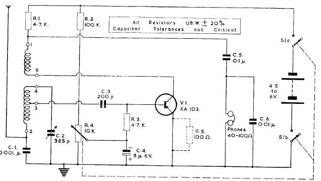 Este receptor usa apenas um transistor, mas tem excelente sensibilidade para a faixa de ondas médias. O circuito foi encontrado em documentação de 1967. O transistor é de germânio.