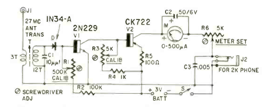 Este medidor de intensidade de campo para a faixa dos 11 metros foi encontrado na revista Radio Electronics de outubro de 1960. O circuito usa um indicador analógico e tem dois transistores.