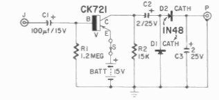 Este circuito para voltímetro eletrônico foi encontrado numa documentação dos anos 50. A sensibilidade é de 100 a 200 mV. O transistor usado é de germânio da época.