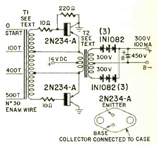 Este circuito de inversor de potência foi encontrado na revista Radio Electronics de dezembro de 1959. Os transistores são tipos da época que devem ser dotados de dissipadores de calor.
