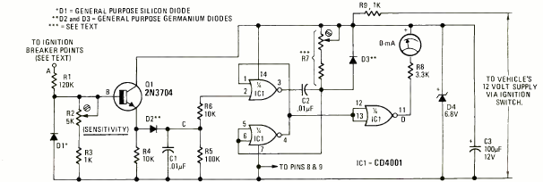 A indicação de velocidade deste circuito é feita num instrumento analógico. O circuito é usado para contar pulsos (rpm) e foi encontrado na revista Radio Electronics de abril de 1976.