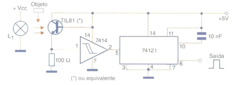 O circuito da figura é sugerido pela Texas Instruments em seu manual de optoeletrônica e consiste num sensor de passagem para objetos numa esteira de linha de montagem. Este circuito usa um fototransistor para detectar a passagem do objeto, o qual gera uma transição lógica numa porta disparadora do tipo 7414. Esta transição é usada para disparar um monoestável TTL, que gera um pulso de contagem ou controle de duração constante no pino 6 de saída. O tempo de duração deste pulso depende do resistor de 15 kohms e do capacitor de 10 nF, componentes estes que podem ser alterados em função da aplicação desejada.