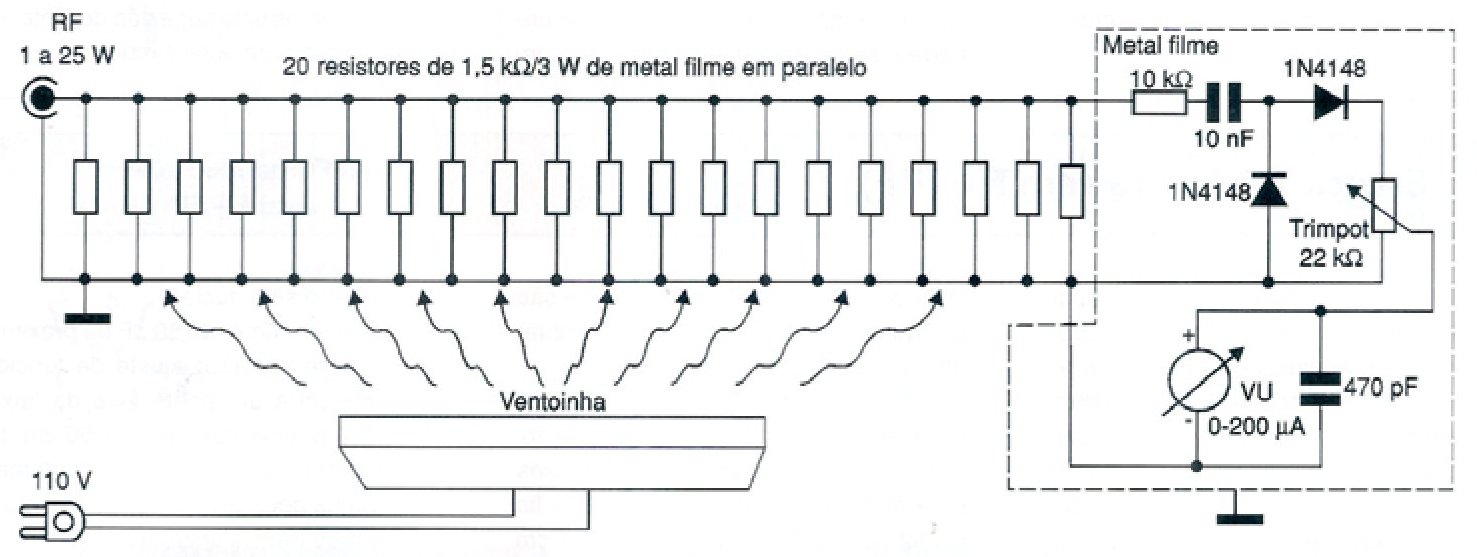 A medida da potência de transmissores de FM de alta potência deve ser feita com o uso de cargas fantasmas em sua saída. O circuito proposto permite medir potências de saída de até 25 W, empregando um VU comum de 0-200 µA ou mesmo aproveitando-se essa escala de um multímetro comum. O aparelho possui ainda uma ventoinha para manter os resistores de carga em baixa temperatura.