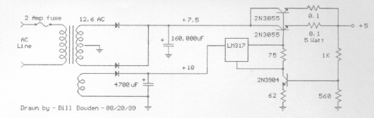 Esta fonte foi encontrada em documentação dos anos 90. Dois transistores de potência são usados para aumentar a capacidade de corrente. Eles devem ser dotados de dissipador de calor.