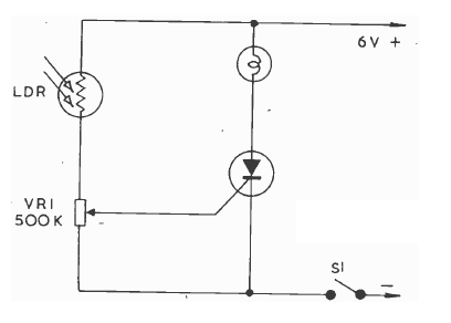 Este circuito tem uma ação oposta ao anterior disparando quando incide luz no sensor. Pode ser disparado por uma lanterna. O SCR pode ser qualquer da família 106.