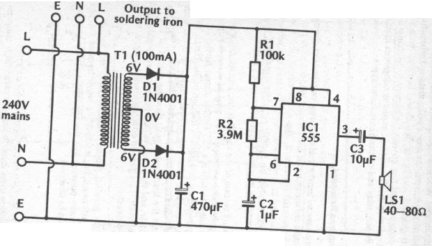 Este circuito indica o funcionamento do ferro de soldar, tendo sido indicado por uma publicação inglesa dos anos 80. A rede local é de 240 V, como podem ver.