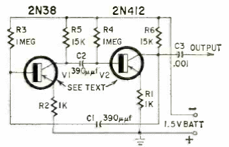 Este circuito é um dos primeiros do tipo a ser publicado. Saiu numa revista de 1952 e usa transistores da época. Os transistores eram de germânio e a alimentação feita com apenas 1 pilha.