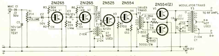 Este amplificador para modulador de transmissores para a faixa dos 11 metros (CB) foi publicado na revista Radio Electronics de novembro de 1961. O circuito é para uso em transmissor no carro.