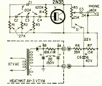 Este injetor de sinais de bancada, alimentado pela rede de energia, foi publicado na revista Radio Electronics de abril de 1963. O circuito usa apenas 1 transistor gerando sinal de baixa frequência senoidal.
