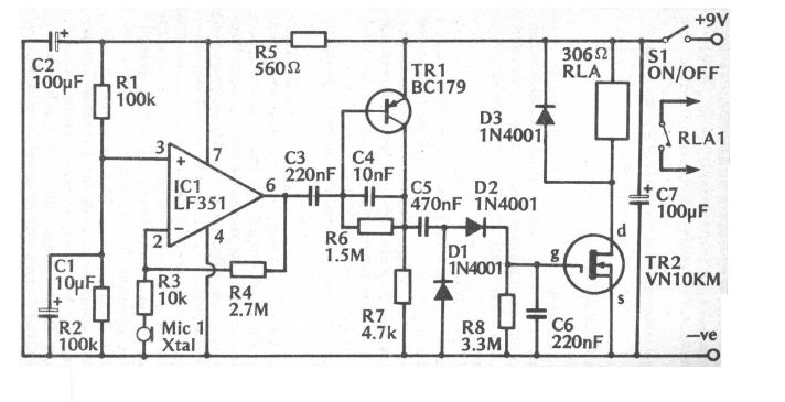 Esta chave sônica ou vox foi encontrada numa documentação inglesa antiga. O operacional admite equivalente assim como os transistores. O microfone é de cristal.
