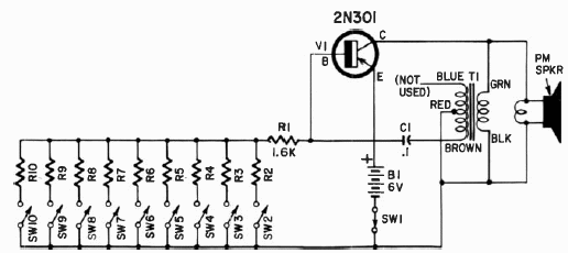 Encontramos este circuito numa documentação de 1966. O transformador é de saída para transistores. Os resistores de 1k a 100k tem valores determinados experimentação. Sugerimos o uso de um potenciômetro de 100k em lugar da rede.