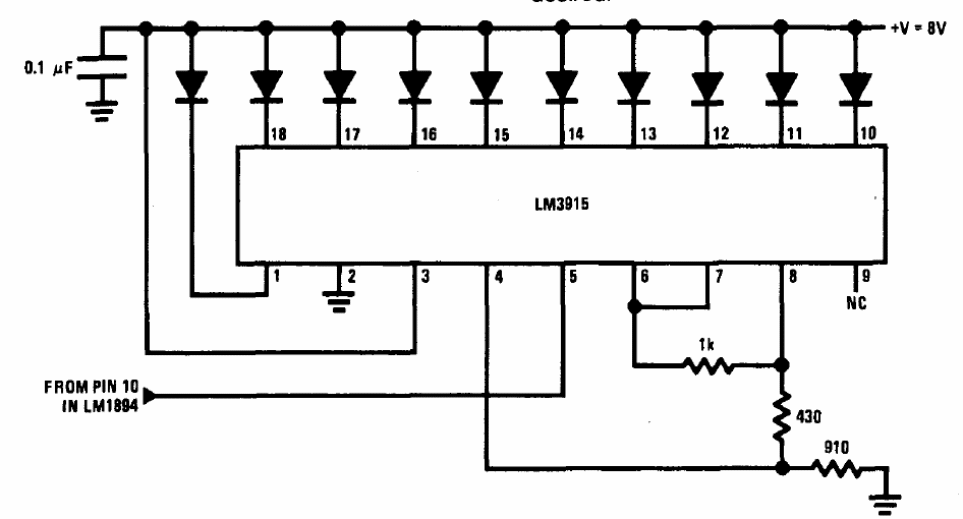 Este circuito foi obtido no Linear Applications Handbook da National Semiconductor de 1994. O LM3915 é um bargraph co 10 saídas onde a faixa dinâmica é determinada pelos resistores no pino 6, 7 e 8. Esta faixa pode ser alterada conforme a aplicação.