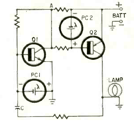 Este circuito é de uma Radio Electronics de abril de 1965. Usa uma lâmpada incandescente e o sensor é um LDR. Os valores dos componentes não foram indicados, mas podem ser deduzidos. O capacitor determina a frequência.