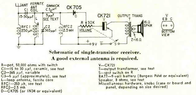 Este simples receptor de 1 transistor tem escuta em alto-falante. Encontramos num artigo publicado na revista Radio Electronics de outubro de 1960.