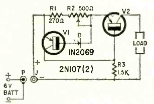Este circuito com dois transistores foi encontrado na revista Radio Electronics de março de 1963. O transistor V2 deve ser de potência montado em dissipador de calor.