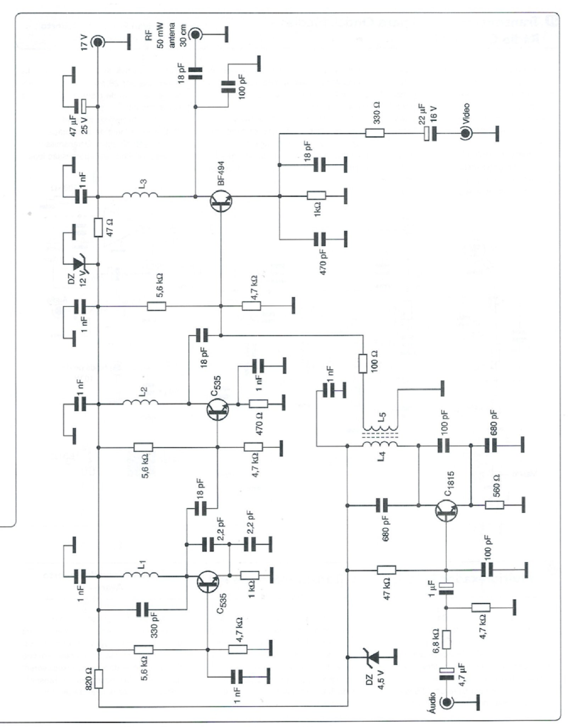 A alimentação deve ser feita por fonte com excelente filtragem, para que não ocorram ondulações na imagem e roncos no som. A antena deve ter cerca de 30 cm de comprimento. Ivan Fernando Roberto - Avaré - SP . Publicado na revista Eletrônica Total 124 de 2007.