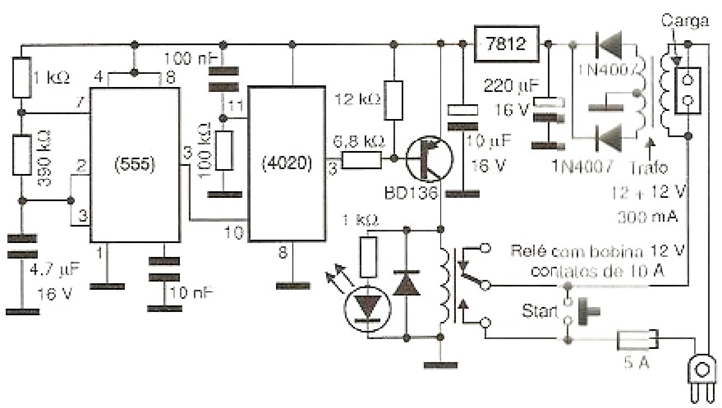 O relé e a carga a ser controlada são alimentados ao pressionarmos o push-button. No final da temporização tanto o circuito quanto a carga deixam de ser alimentados. A presença da rede RC no pino 11 do 4020 faz a função de reset automático, pois o circuito é ressetado assim que é feita sua alimentação, garantindo que a contagem parta de zero. A alimentação pode ser feita com tensão de 110 V ou 220 V, bastando apenas atentar para a tensão de primário do transformador a ser utilizado que deve ser igual à da rede local. Alexandre Coelho