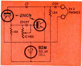 Este circuito tem um controle de frequência. Encontramos numa Radio Electronics de janeiro de 1965. O fone é de alta impedância e os transistores são tipos antigos de germânio.