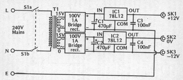 Encontrada numa documentação inglesa de 1989, esta fonte usa componentes atuais. As pontes retificadoras podem ser substituídas por ponte de diodos comuns.