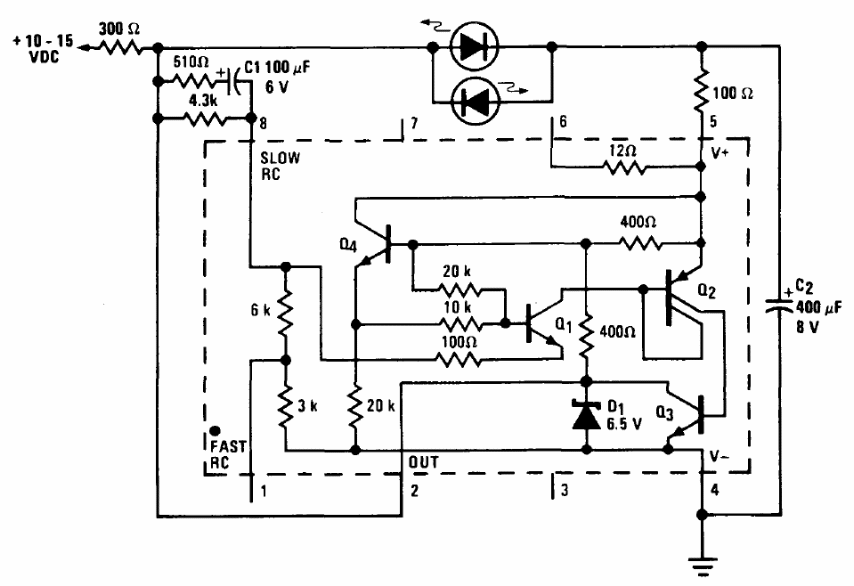 O circuito apresentado na figura faz uso de um LM3909, um CI de baixo consumo e baixa tensão. O circuito alimenta dois LEDs alternadamente, podendo ser de cores diferentes. Encontramos esta aplicação numa documentação da National Semiconductor.