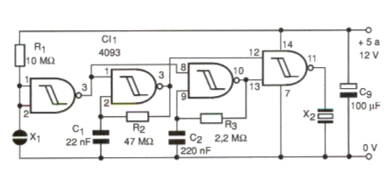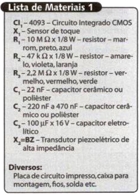 O circuito mostrado na figura 1 gera um tom intermitente em um transdutor piezoelétrico, quando o sensor de toque é ativado. A frequência do tom é dada basicamente por R2 que pode ter valores entre 10 k e 100 k ohms. Será interessante determinar o valor que produz o som de maior volume no transdutor, pois, muitos deles têm seu rendimento máximo numa frequência de ressonância em torno de 4 kHz. A intermitência depende de R3 e C2 que também podem ser alterados numa boa faixa de valores. O transdutor cerâmico fornece uma boa potência de áudio para aplicações alimentadas por pilhas ou bateria de 9V, uma vez que tem baixo consumo. No entanto, para aplicações em que maior potência se faz necessária, ou ainda em que o leitor deseje usar um alto-falante, as etapas de potência da figura 2 podem ser utilizadas. Para alimentação acima de 9 V, o transistor deve ser dotado de um radiador de calor. O sensor de toque consiste em duas chapinhas de metal separadas, que devem ser tocadas simultaneamente.