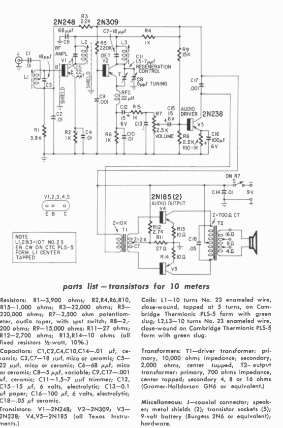 Encontrado em livro sobre os transistores dos anos 50. Este receptor é bastante sensível apresentando reprodução em alto-falante. Os transistores são da época.
